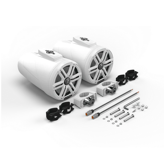 The M2WL-8 Color Optix™ 8" 2-way speakers deliver loud, clear, accurate sound, and light the way for your fresh or salt-water journey! The M2 can be installed using direct mount or a clamp mount method that provides 360-degree rotation on wake tower bar sizes from 1.5” to 3”. The M2 includes stainless-steel and white “sport” grille inserts and features a rear illuminated 3DIL™ medallion that can be rotated 360-degrees for proper orientation.  The speakers connect with the Rockford Fosgate Color Optix™ Controller (sold separately) and RF Connect App, allowing you to customize both front speaker and rear medallion with your own color patterns.